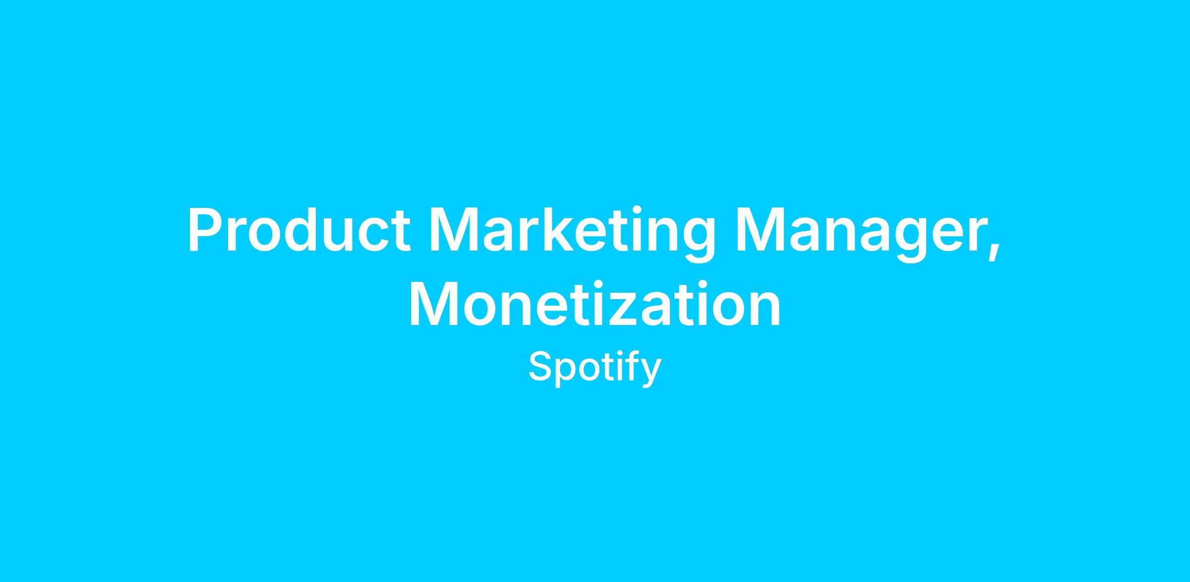 We’re seeking a Product Marketing Manager (PMM), based in the United States, to join our Monetization Product Marketing team. In this role you’ll work alongside a group of PMMs focused on advertiser experience, supporting the unification and evolution of Spotify’s ad formats. This role will serve as the voice of the customer by developing go-to-market strategies that improve product adoption and revenue growth while driving real business outcomes for our advertising partners. This is a highly cross-functional role and offers the opportunity to make a significant impact on our rapidly growing ad business, spanning the world of audio and video from music to podcasts and beyond. The Monetization Product Marketing team sits within the Global Product and Commercial growth team and partners closely with leaders across product management, engineering, design, business development, business marketing, learning & development, business operations and PR/communications teams.